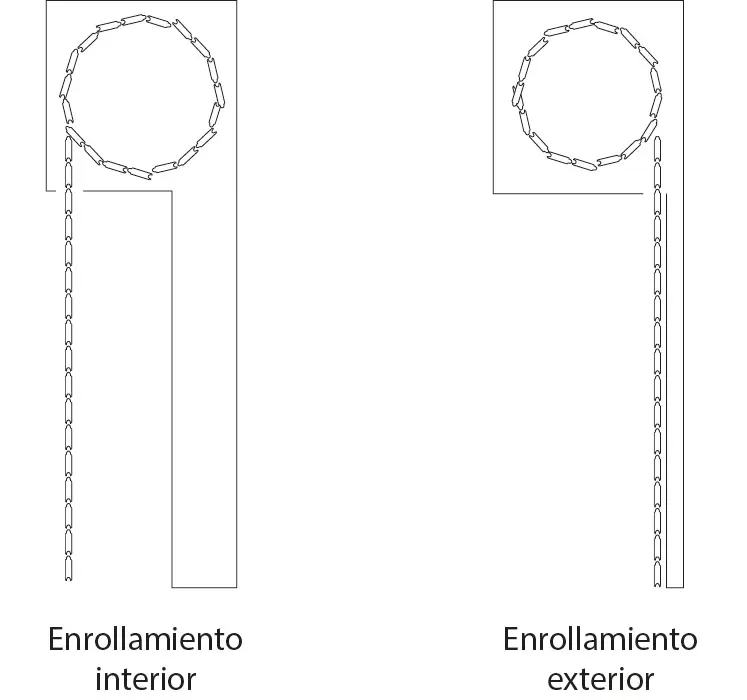 Las persianas tienen deferentes enrollamientos, las hay de enrollamiento interior y las de enrollamiento exterior. Este dato es muy importante conocerlo ya que los ganchos de la persiana tienen mano y se montan según su enrollamiento. Al fabricar la persiana con el enrollamiento equivocado vas a tener problemas con el tiempo ya que los ganchos que van entre lamas se van abriendo poco a poco hasta que la persiana se parte en dos.